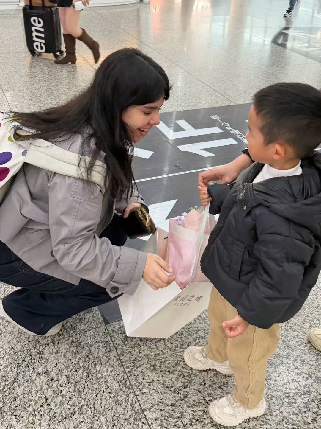 男孩手捧鲜花接机来自阿尔及利亚互惠生姐姐
